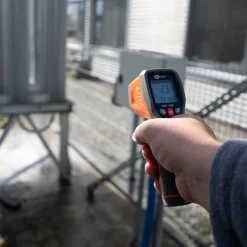 Su sistema óptico recoge la radiación infrarroja emitida por el objeto y la transforma en datos de temperatura mediante un sensor de alta sensibilidad. Gracias a su resolución de 0,1 °C y su rango amplio de -50 °C a 1000 °C, permite identificar puntos críticos de sobrecalentamiento en instalaciones eléctricas, transformadores, rodamientos o conexiones.