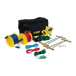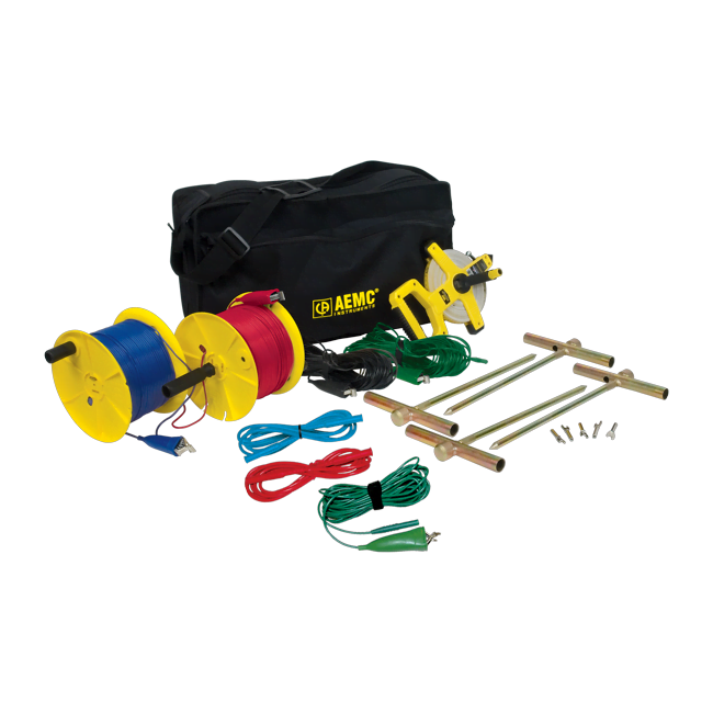 El conjunto 2135.61 incluye cables de 150 m y accesorios de conexión, lo que permite realizar ensayos de gran alcance en mallas de subestaciones, plantas fotovoltaicas e instalaciones industriales.